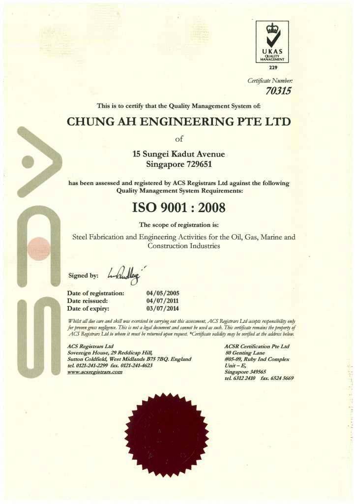2005: Certified to ISO 9001:2008 for Steel Fabrication and Engineering Activities in the Oil, Gas, Marine, and Construction Industries.
